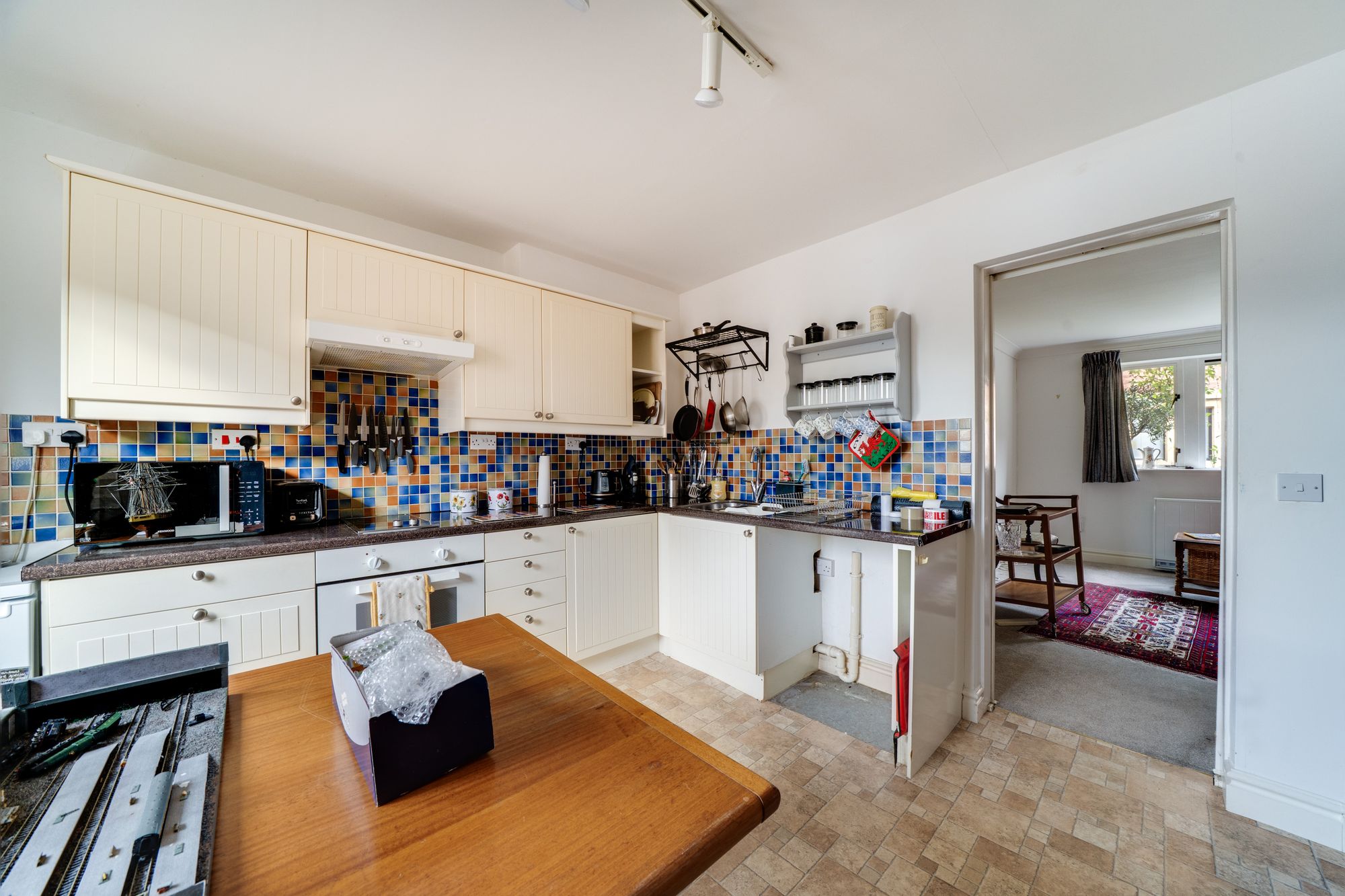 The kitchen/diner is fitted with a range of cream-coloured units with contrasting work surfaces and tiled splashbacks. There is space for a dining table, making this a practical and sociable room for everyday use, with a window providing natural light and pleasant views.