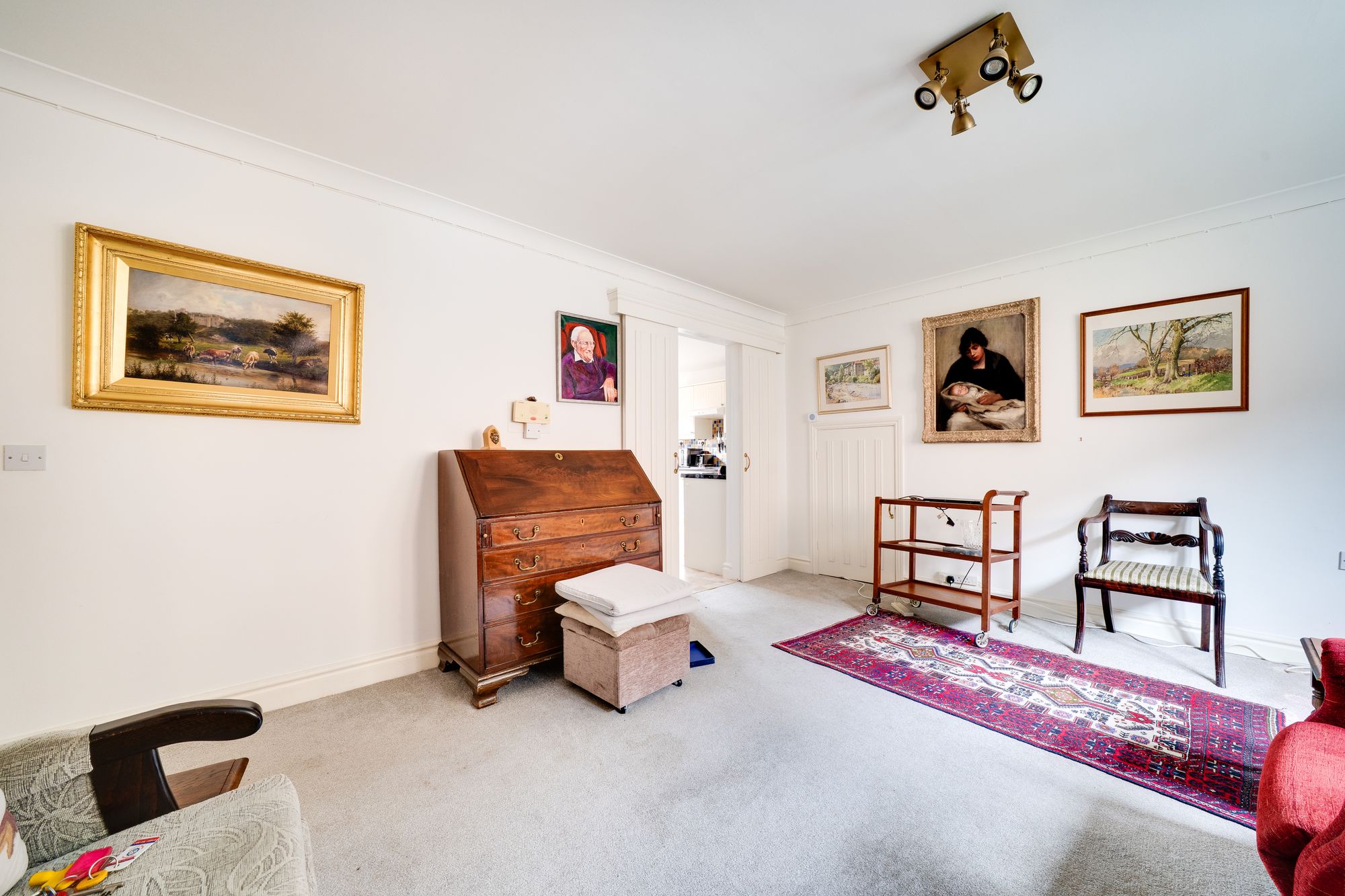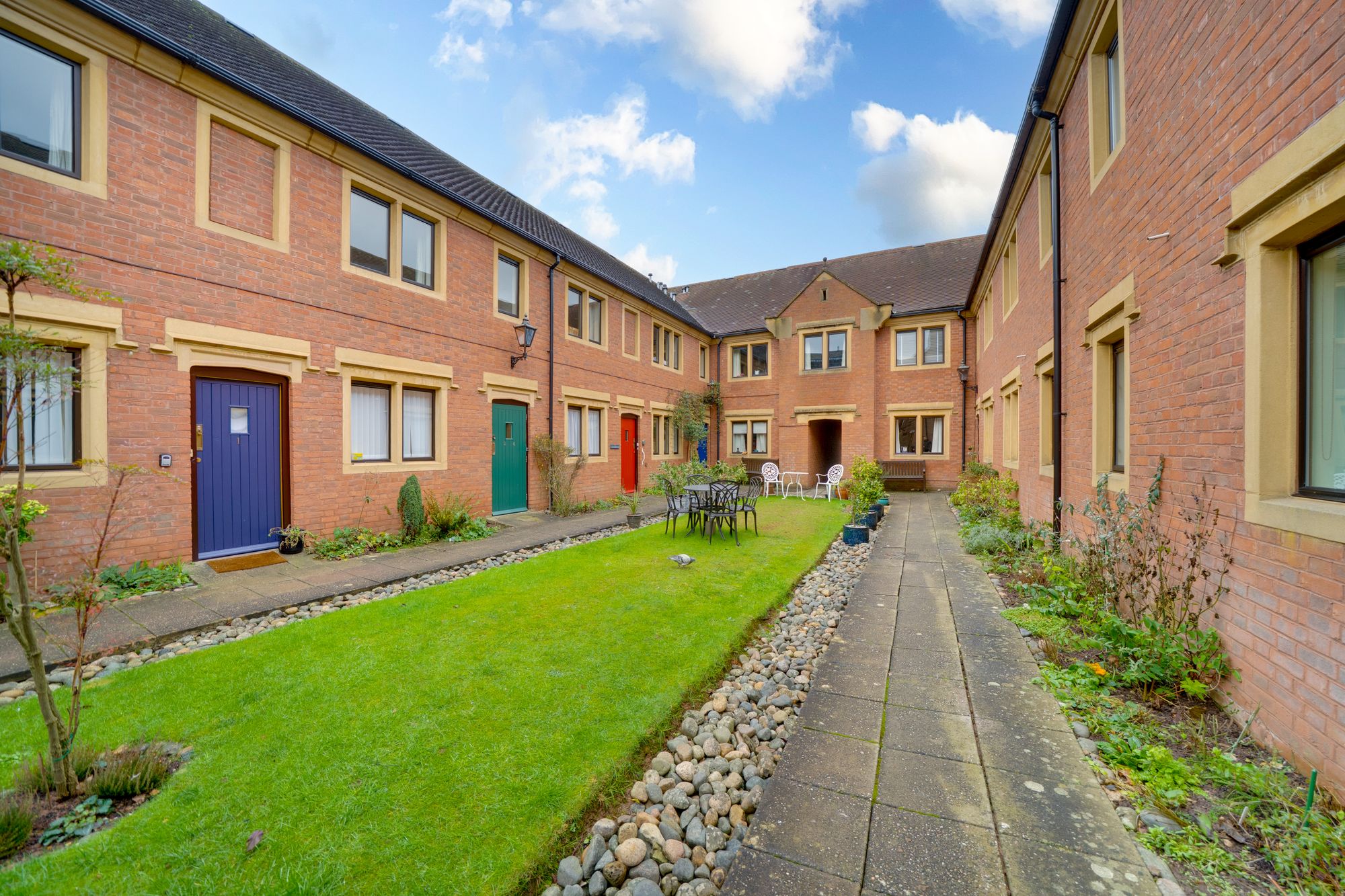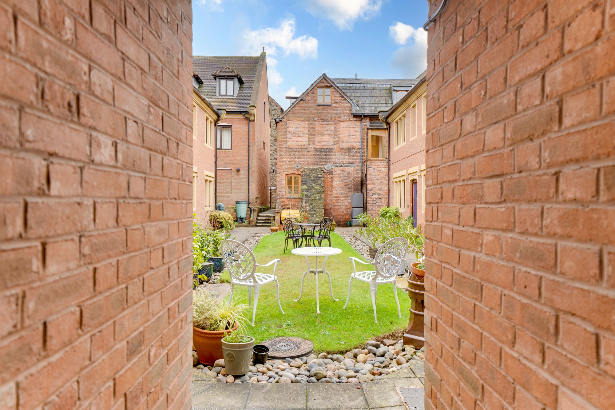 The property is approached via a well-maintained communal courtyard, featuring areas of lawn, established planting and seating, creating a pleasant and sociable environment. A private front door opens into a welcoming hall, providing access to the principal accommodation.
