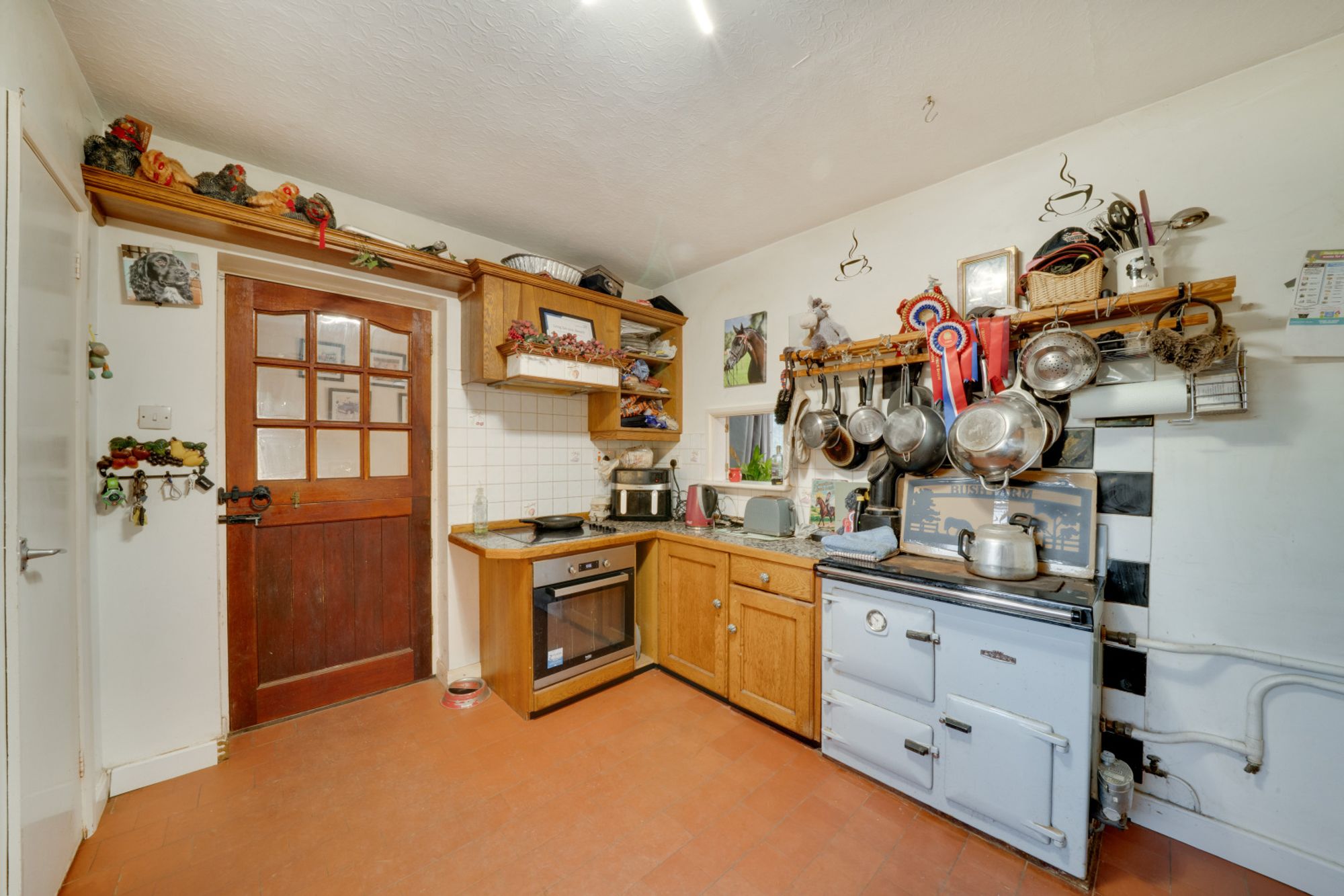 The kitchen is well appointed, fitted with matching wall and base units, quarry-tiled flooring, and a traditional Rayburn, creating a warm and inviting focal point. There is ample storage and work surface space, and a pleasant outlook to the front of the property.