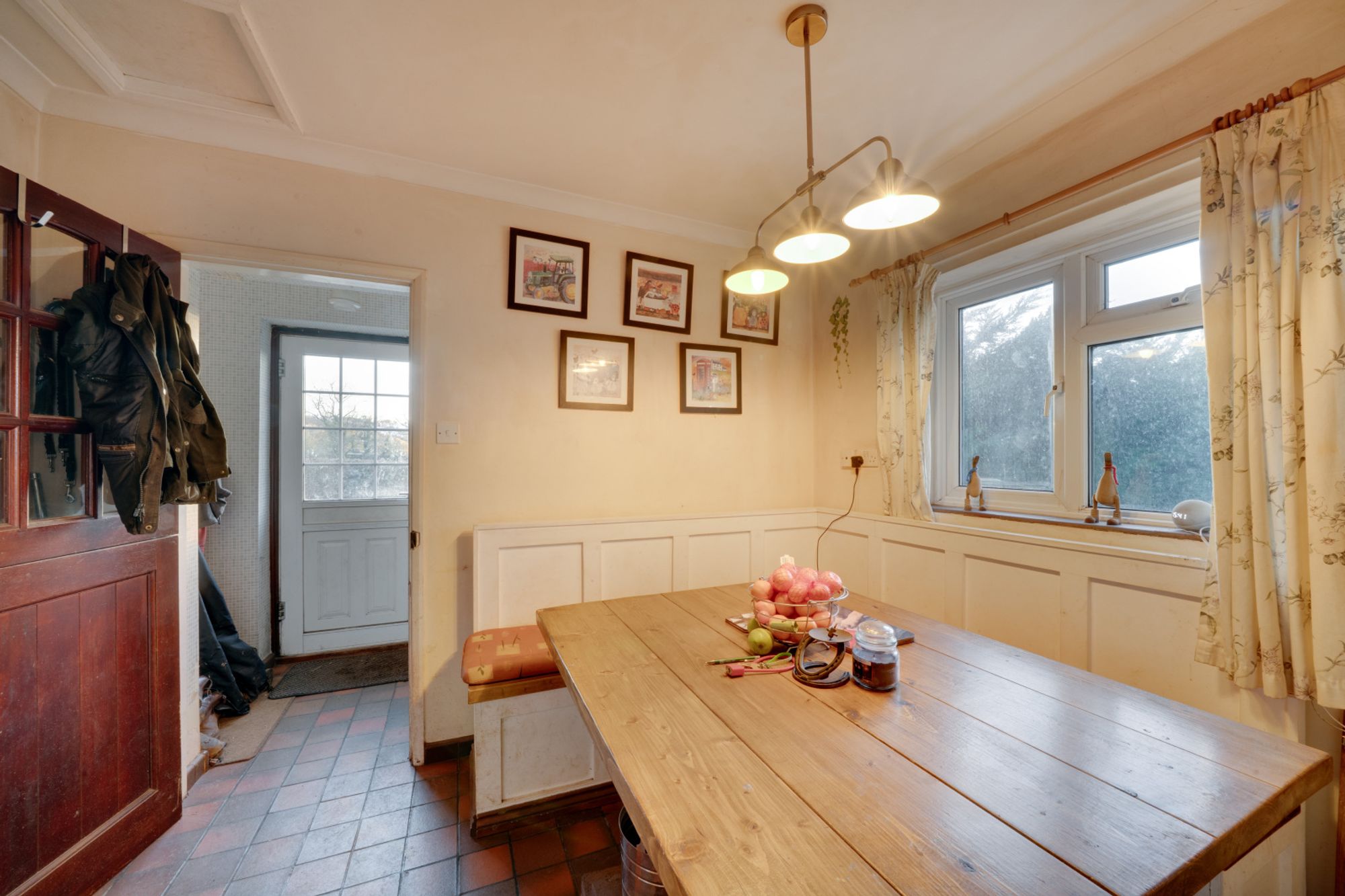 You are welcomed through an entrance hallway, with a second side entrance providing access via a small porch. From here, a door opens into the dining room, a cosy, characterful space featuring a built-in dining table with an L-shaped seating arrangement. This room enjoys views out to the garden and connects neatly to the remainder of the accommodation. A shower room is positioned off the porch for added convenience.