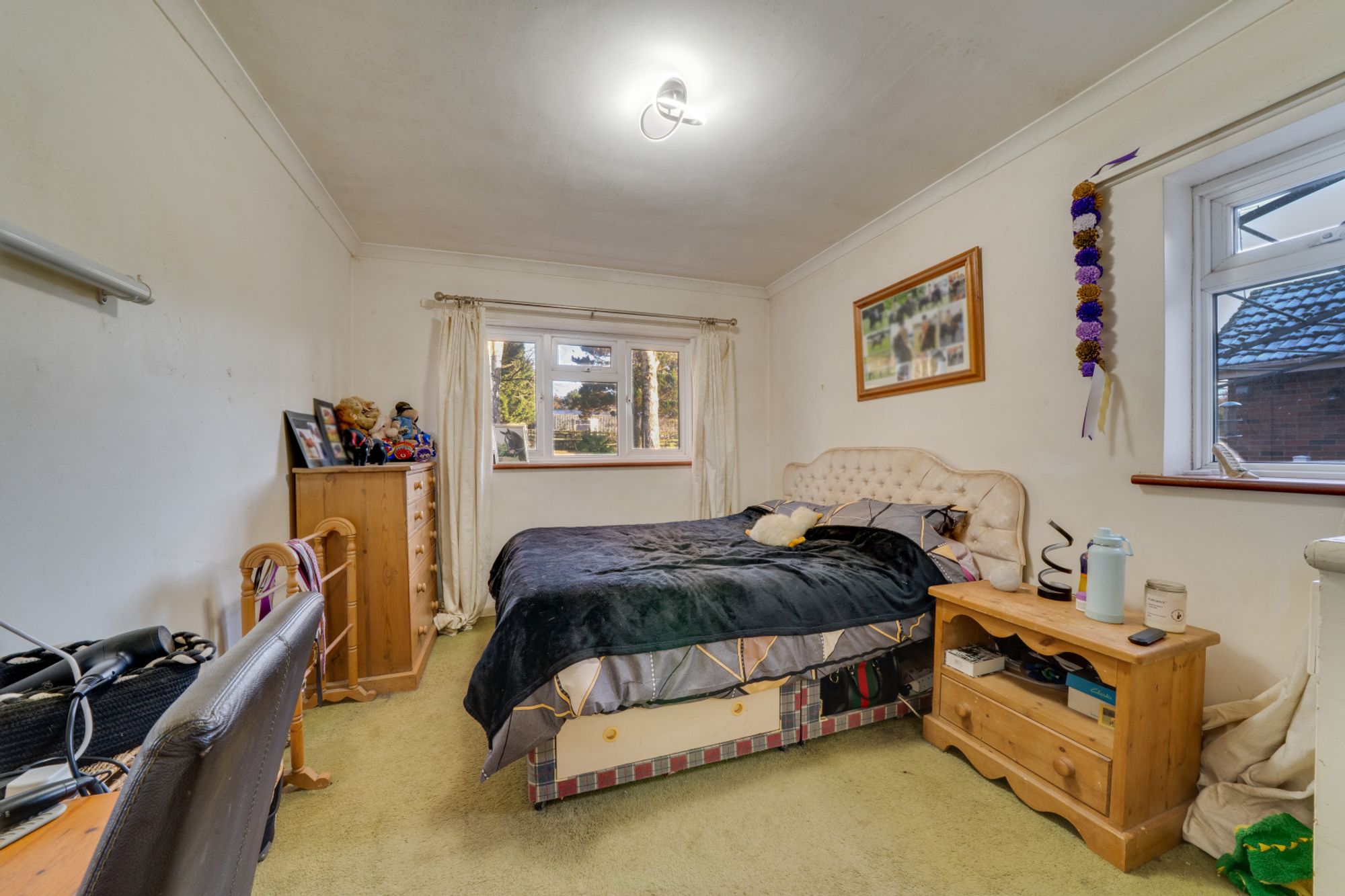 Leading from the dining area is a well-proportioned family room, currently used as a multi-purpose space. With dual windows and French doors opening onto the decking, this room is bright and adaptable, offering potential as a third bedroom, studio, playroom or office.