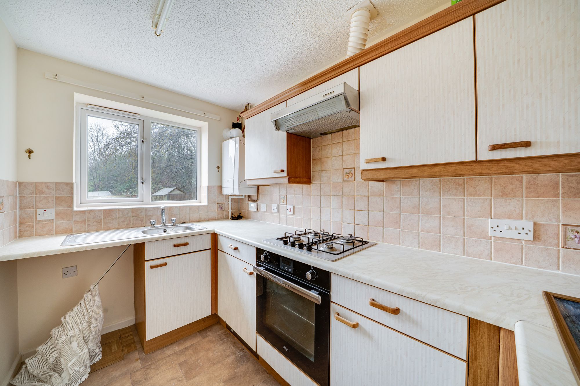 The ground floor features a welcoming entrance hall leading through to a spacious living room, filled with natural light and offering a versatile space for both relaxing and entertaining. The adjoining kitchen provides ample storage and workspace and would benefit from a little modernising, allowing the next owner to create a stylish and contemporary heart of the home.