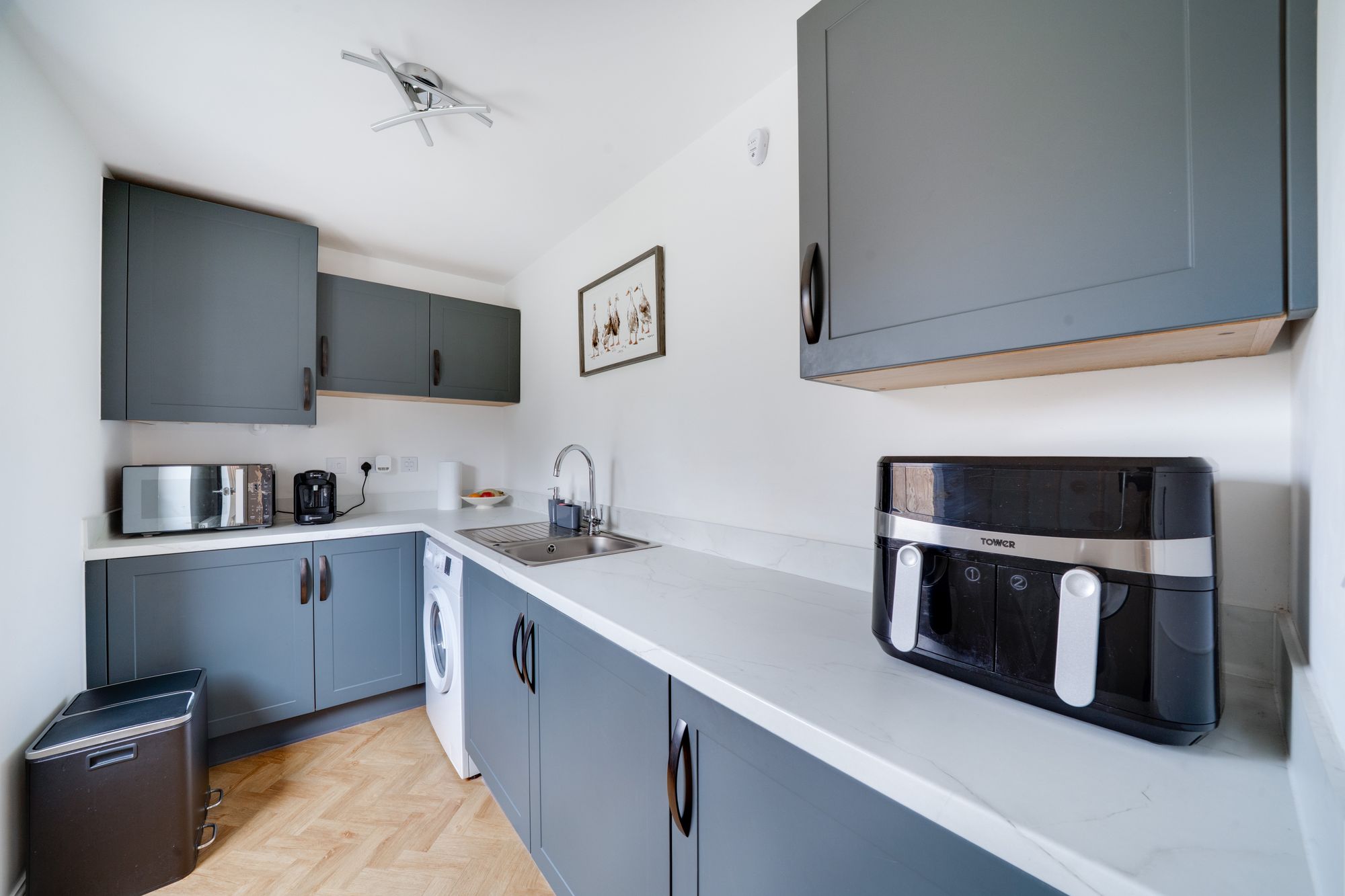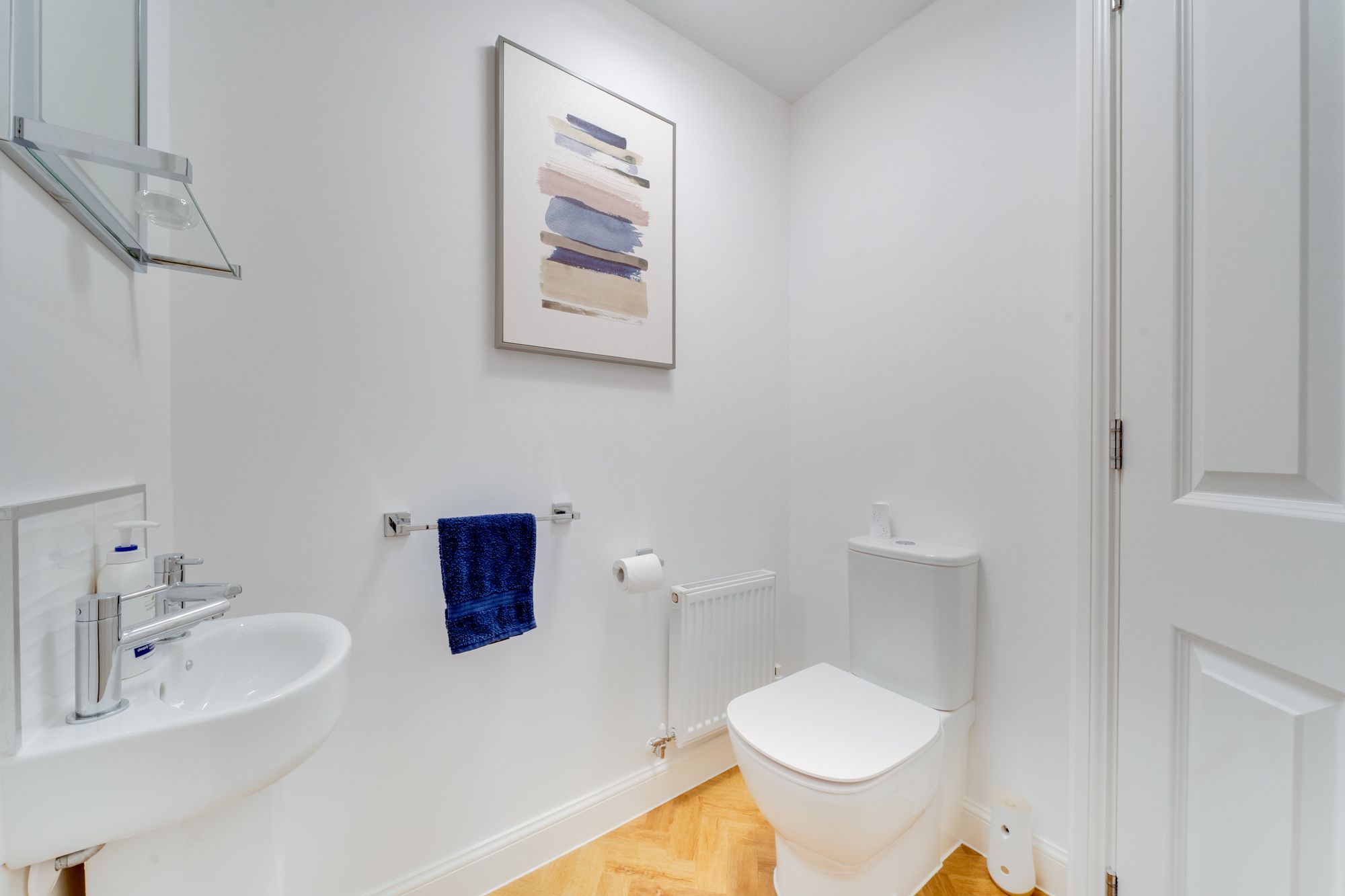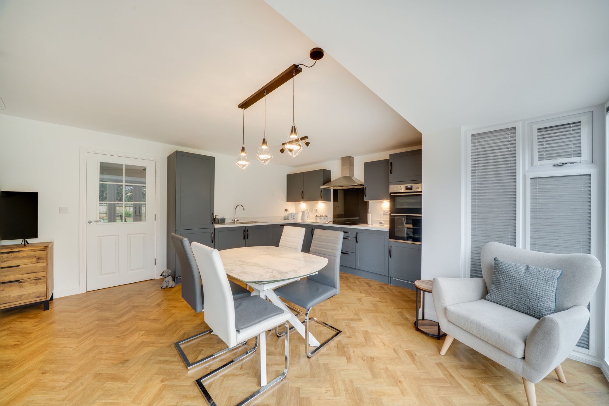 To the rear of the property lies the heart of the home – a stunning fully integrated kitchen/diner. Designed with both style and functionality in mind, this contemporary space features sleek cabinetry, high-quality integrated appliances, and generous work surfaces. The open dining area provides an ideal setting for family meals and social gatherings, with doors opening out to the rear garden to create a seamless connection between indoor and outdoor living. A separate utility room adds further practicality, and there is also a convenient ground floor cloakroom.