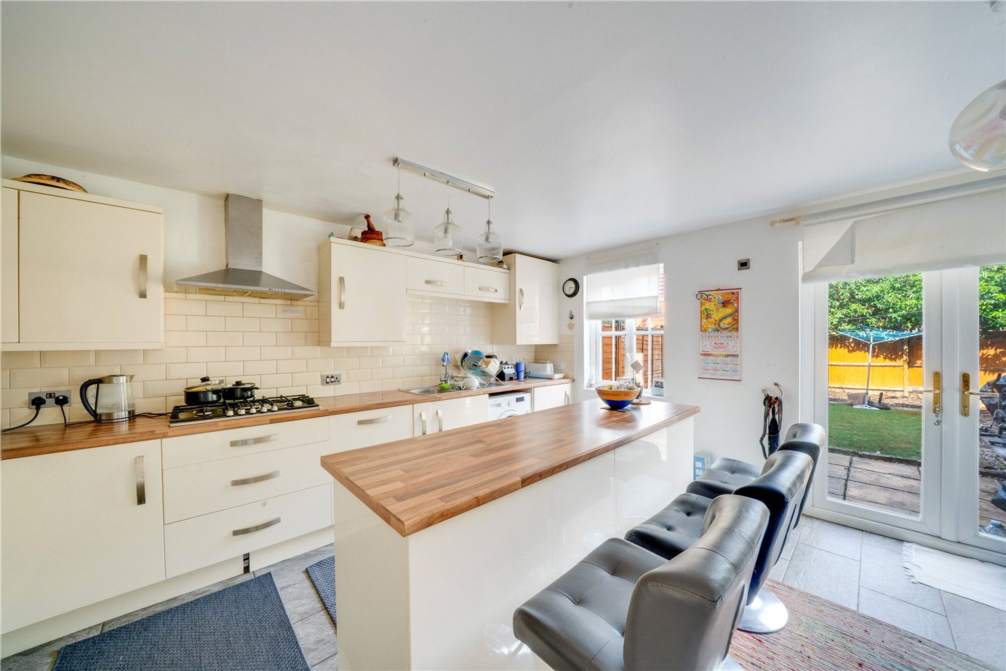 To the front of the property, there are two allocated parking spaces, providing convenient access for residents and visitors alike. Stepping inside, the welcoming entrance hall leads to a versatile sitting room, perfect for use as a home office, snug, or additional family space. To the rear, the modern kitchen is the heart of the home, thoughtfully designed with a central breakfast island, creating both a practical workspace and a sociable hub for family life. French doors open directly onto the garden, filling the space with natural light.