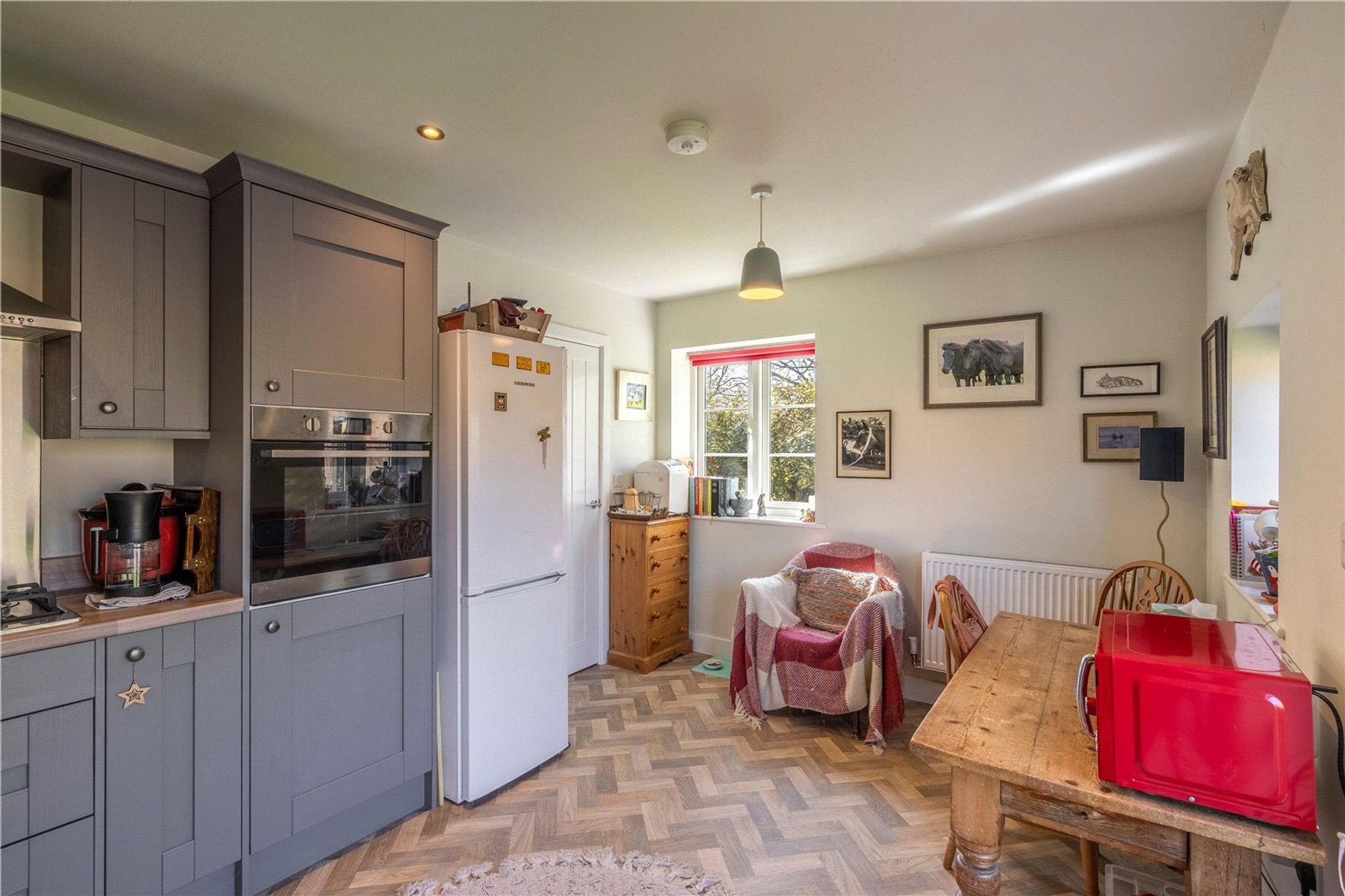 The accommodation is arranged over two floors and reveals a tasteful combination of spacious living areas, period detailing, and practical design. The ground floor boasts a generous kitchen/dining room at the front of the property, complete with ample natural light and functional layout—perfect for both informal meals and entertaining. A separate lounge provides a comfortable retreat, while the additional sitting/dining room to the rear extends the living space further, with a sense of warmth and flow enhanced by sympathetic interior styling. A convenient ground floor WC and under-stairs storage add to the practicality of the home.