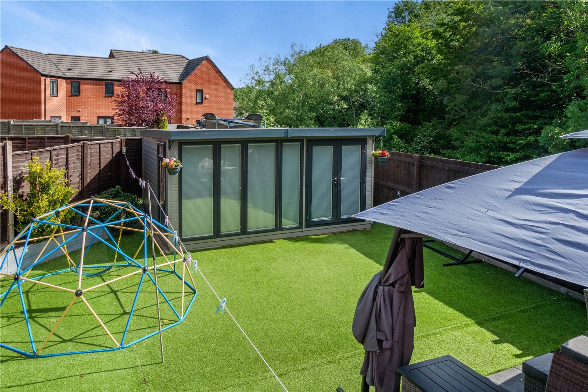 The rear garden is a standout feature of the property. It includes a generous patio area perfect for outdoor dining and entertaining, along with a low-maintenance artificial grass section ideal for children or pets. At the end of the garden is a large, versatile garden room — ideal for use as a home office, gym, studio, or additional entertaining space, providing fantastic flexibility to suit a variety of needs.