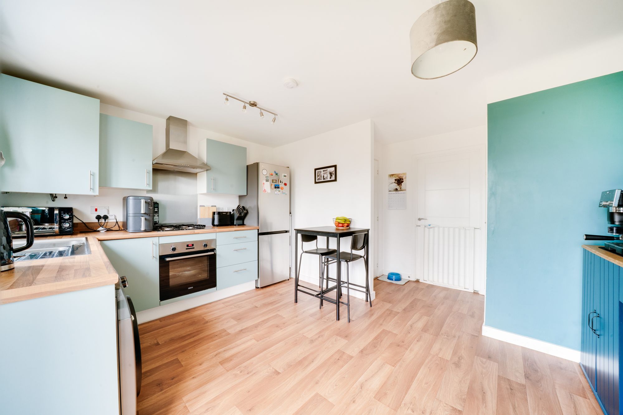 The ground floor opens into a welcoming entrance area which leads through to a bright and inviting living room, creating a comfortable space to relax and unwind. Positioned to the rear of the property is a well-appointed kitchen and dining area which forms the heart of the home, offering a sociable environment for everyday living as well as entertaining. French doors provide direct access to the rear garden, allowing natural light to fill the room and creating a seamless connection between indoor and outdoor spaces. A convenient ground floor WC completes the accommodation on this level.