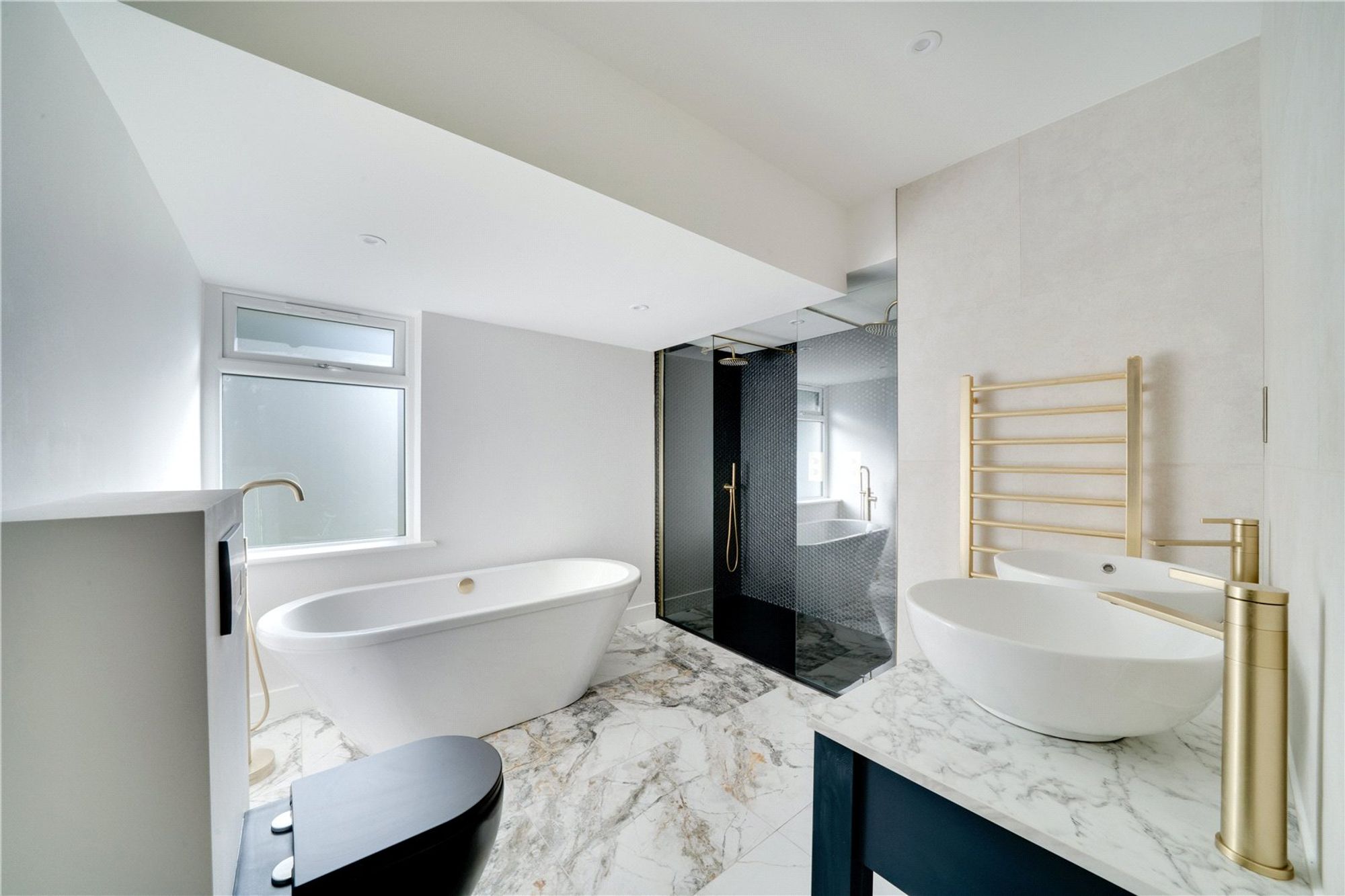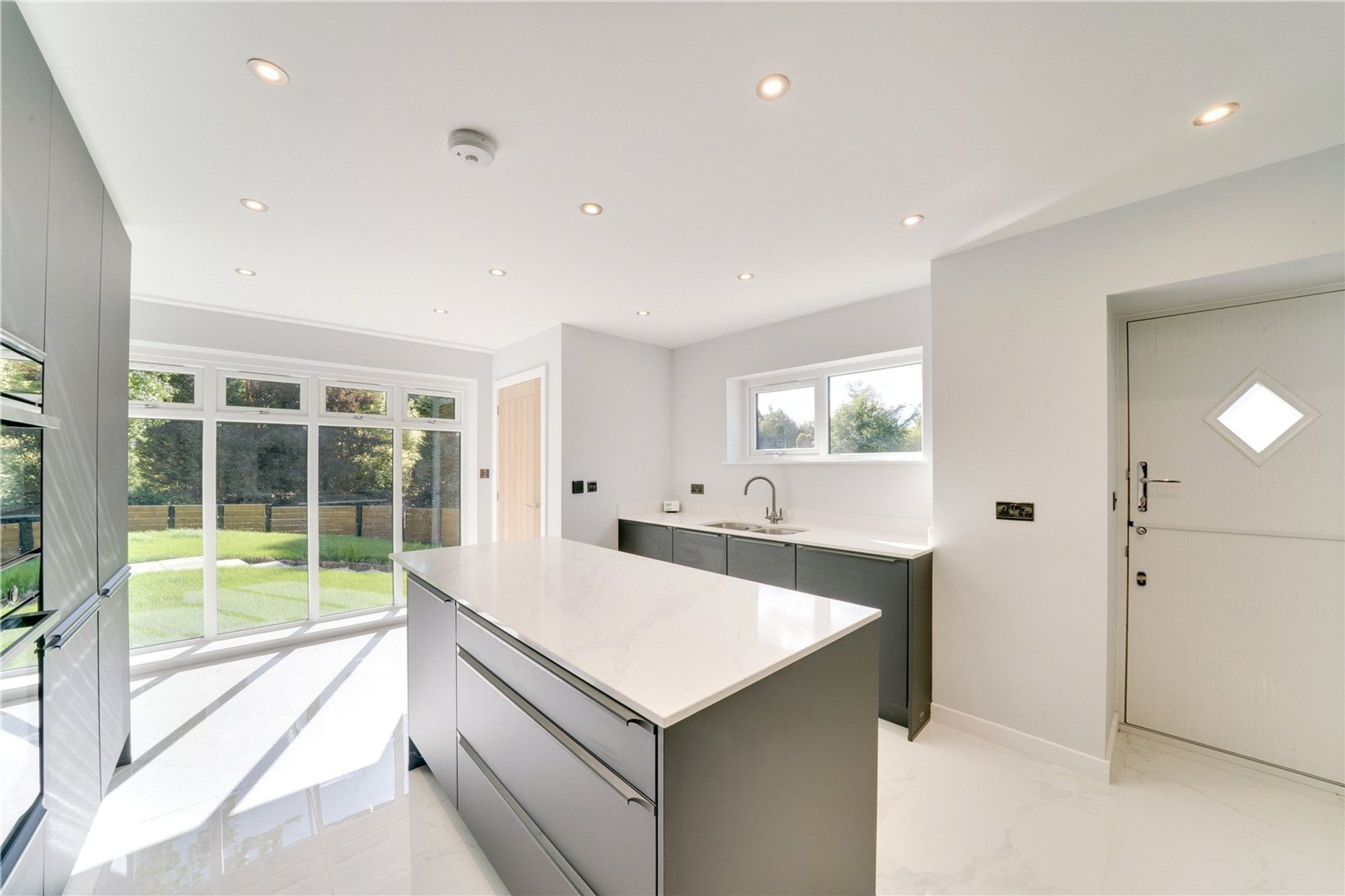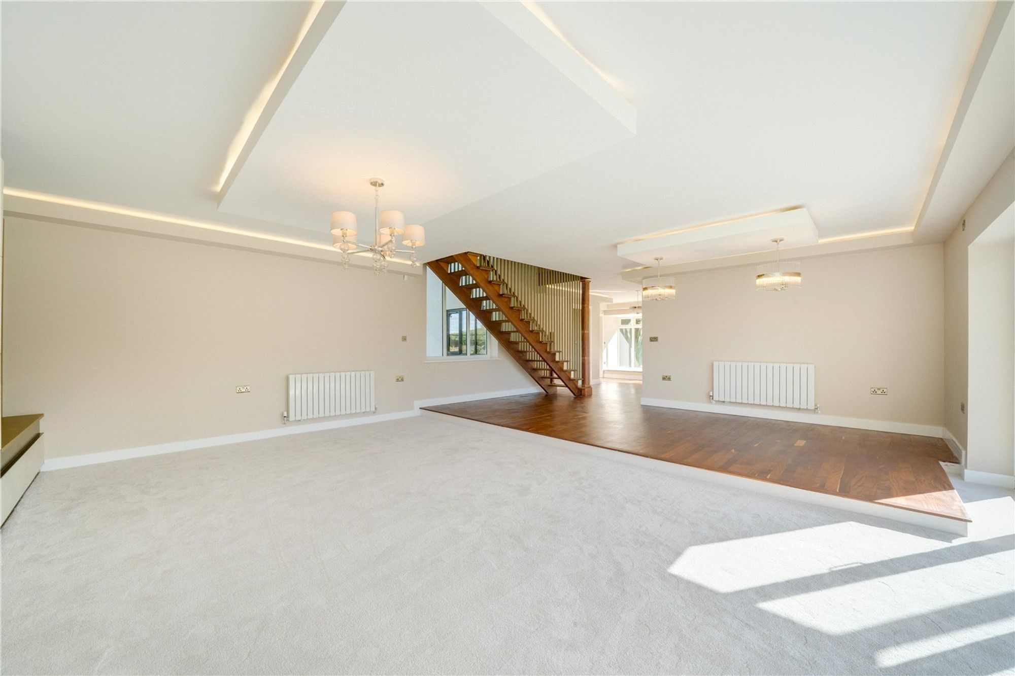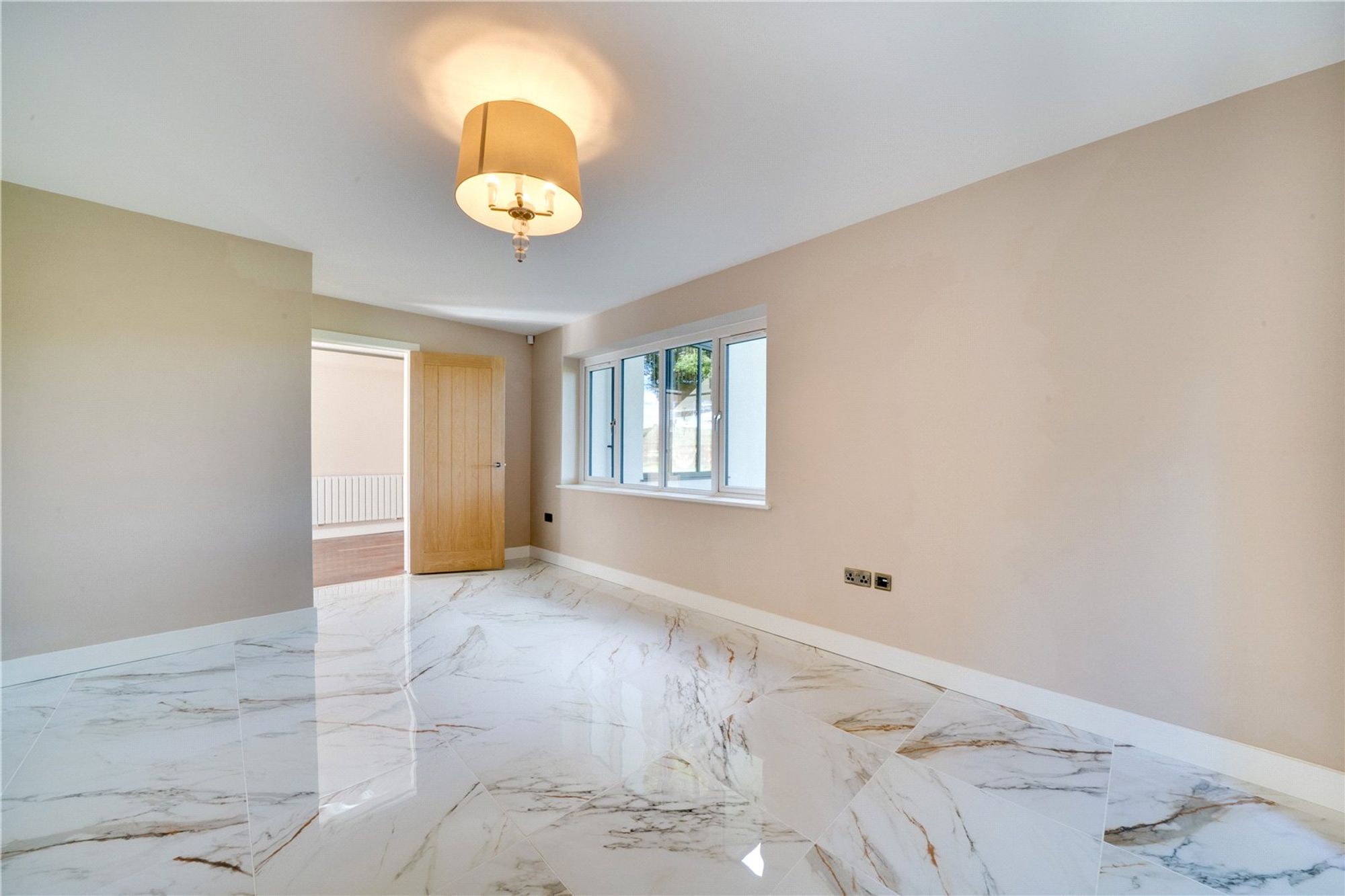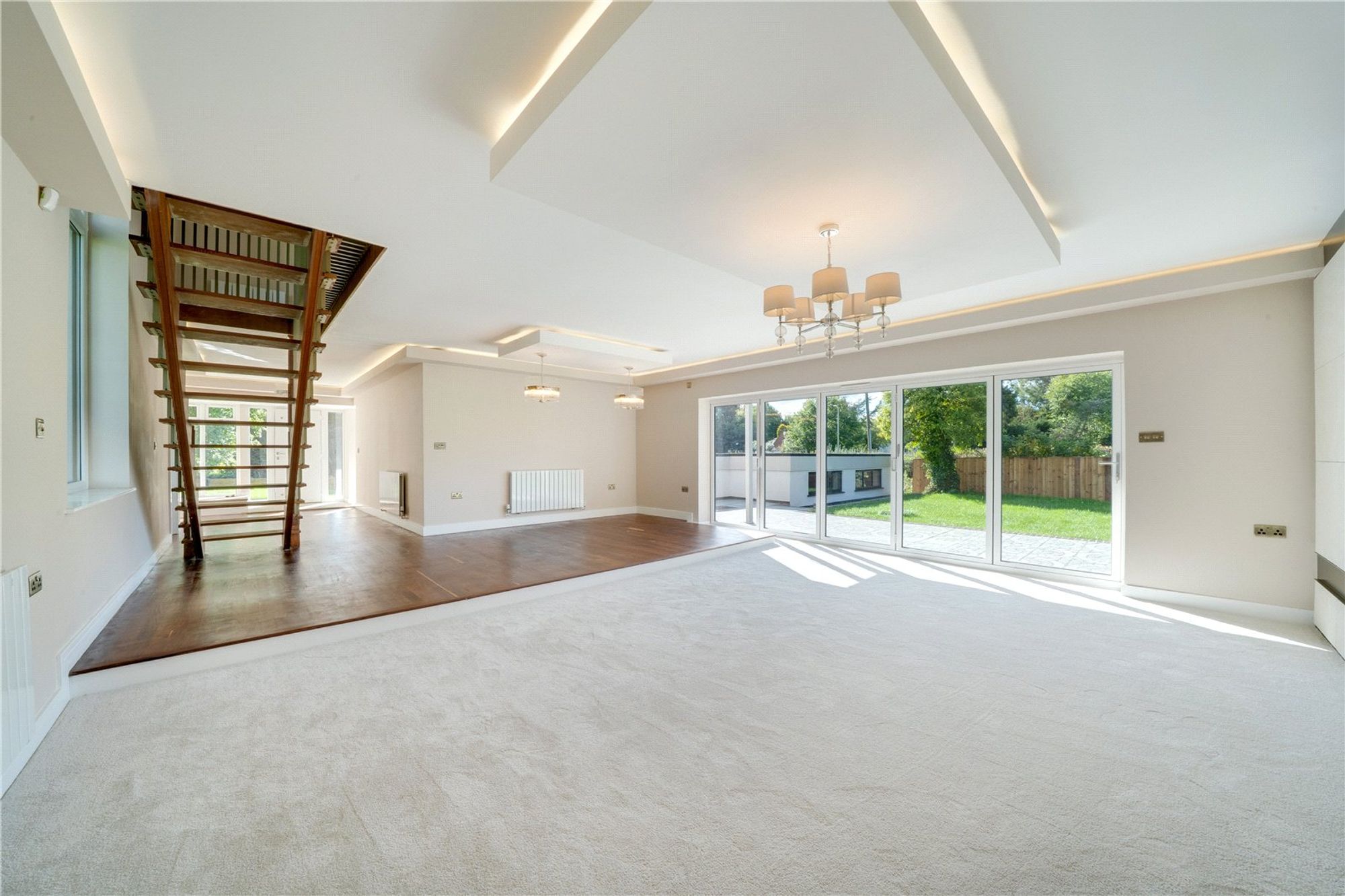 The ground floor is designed for both elegance and ease of living. The impressive living room opens out through bi-fold doors onto the garden, creating a seamless connection between inside and out. A second sitting room provides a versatile space for entertaining or relaxing. The kitchen is finished to the highest standard, featuring contemporary design and integrated appliances, making it a joy for everyday living or hosting. Practicality is equally considered, with a dedicated laundry room and a guest cloakroom complementing the living spaces.