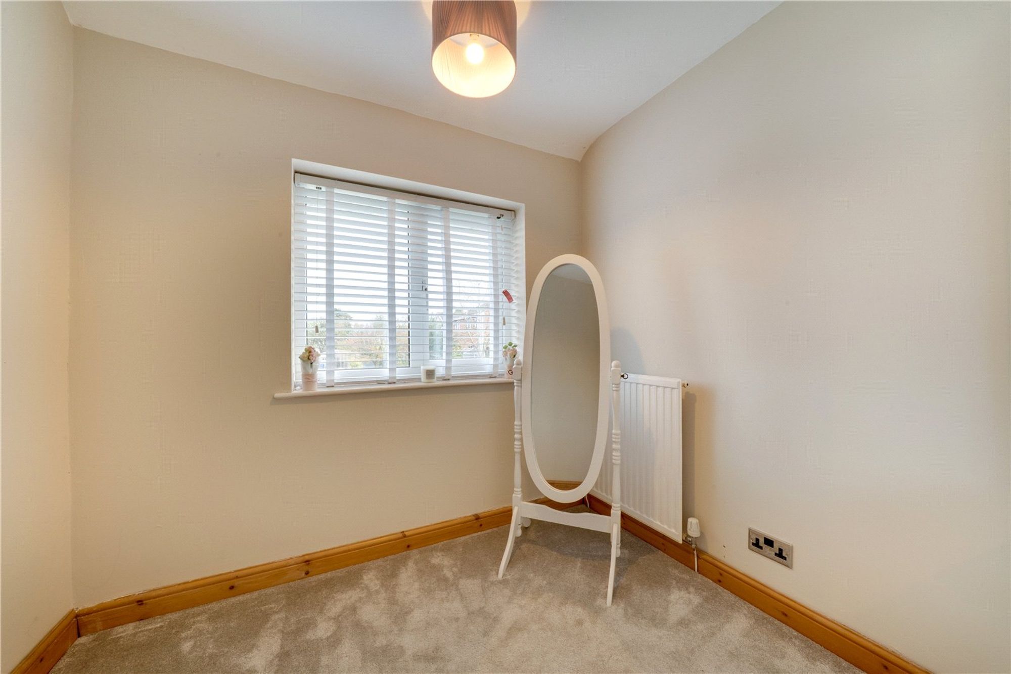 Upstairs, the property offers three comfortable bedrooms, each with its own character. The main bedroom benefits from fitted wardrobes, while the second bedroom also includes built-in storage. The third bedroom provides the ideal setting for a child’s room, study or guest space, all serviced by a neatly appointed family bathroom.