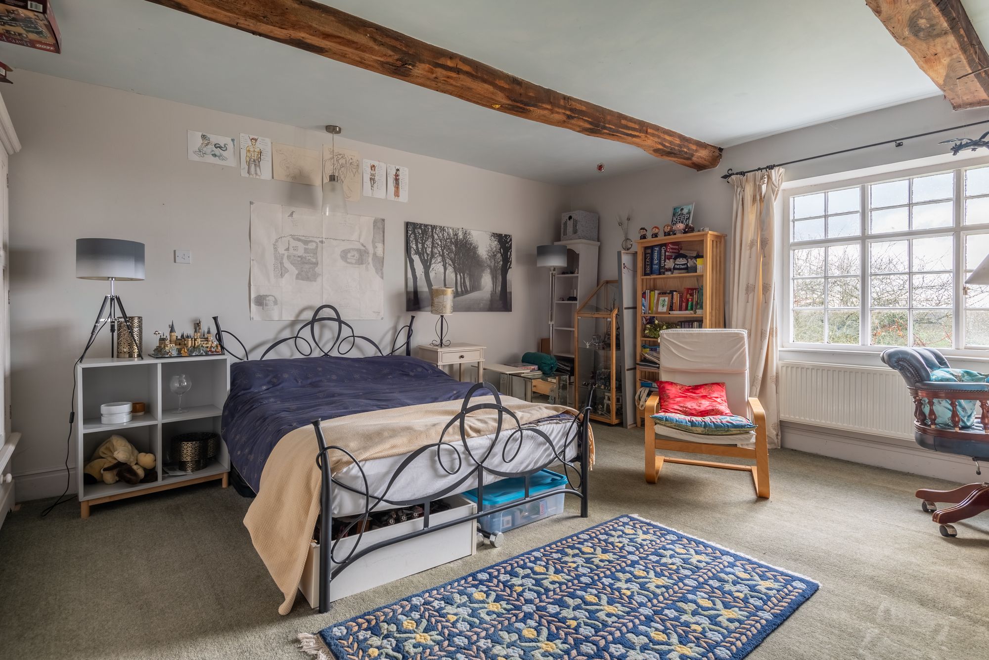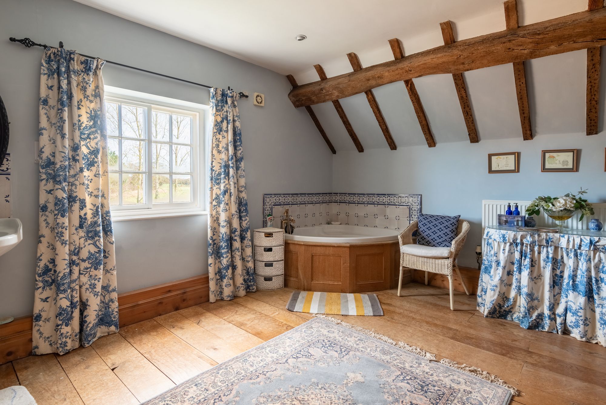 A particularly characterful feature of the house is the spacious library/sitting room with its wood-burning stove. Formerly a cheese room, this generous and versatile space could equally serve as a principal suite, studio, or an excellent informal living area.
