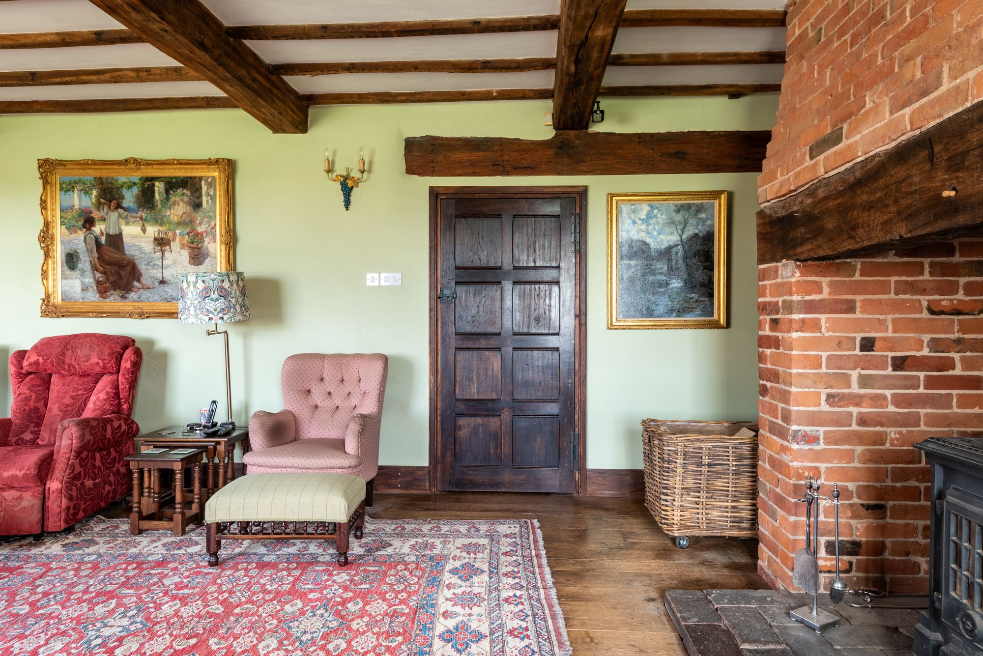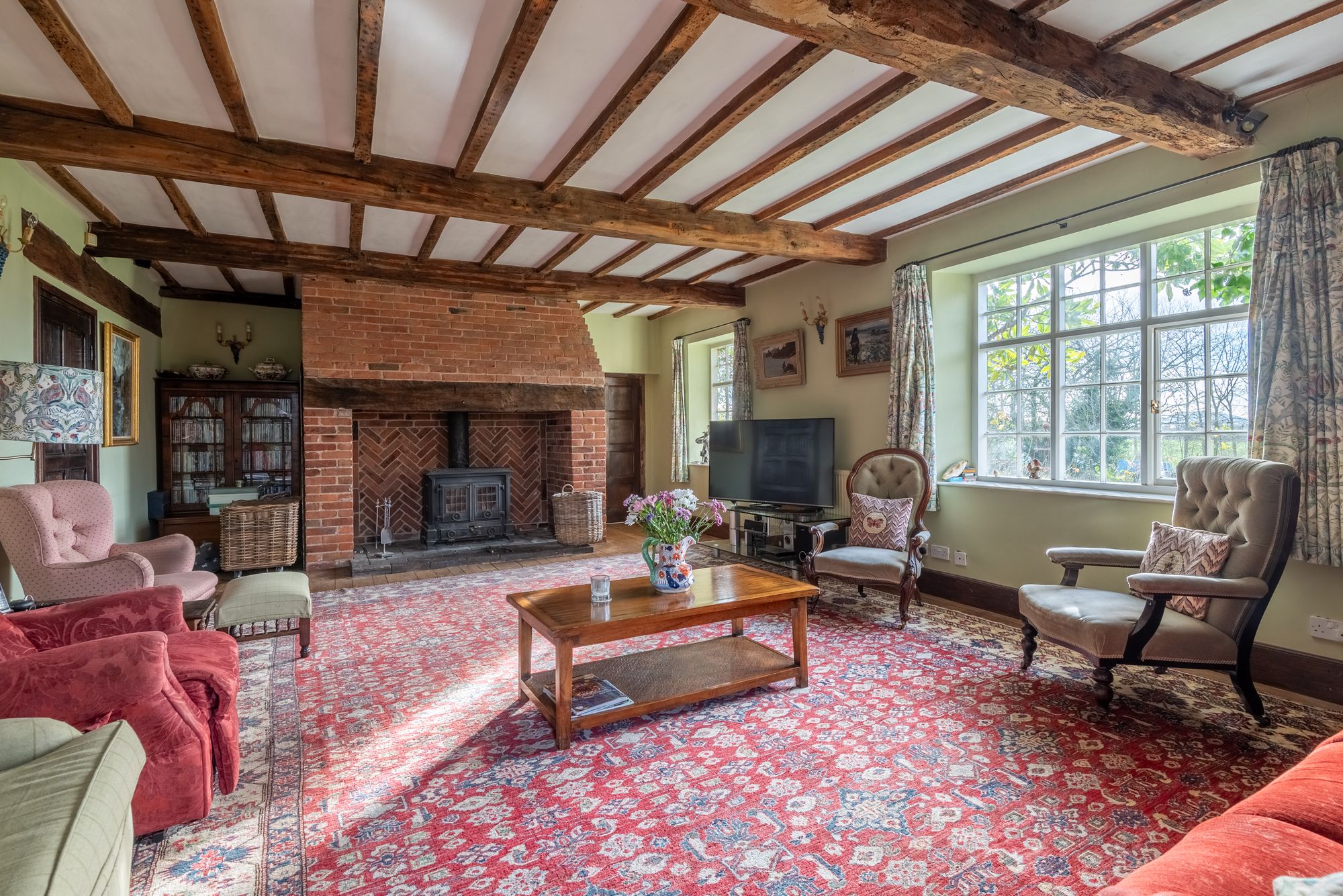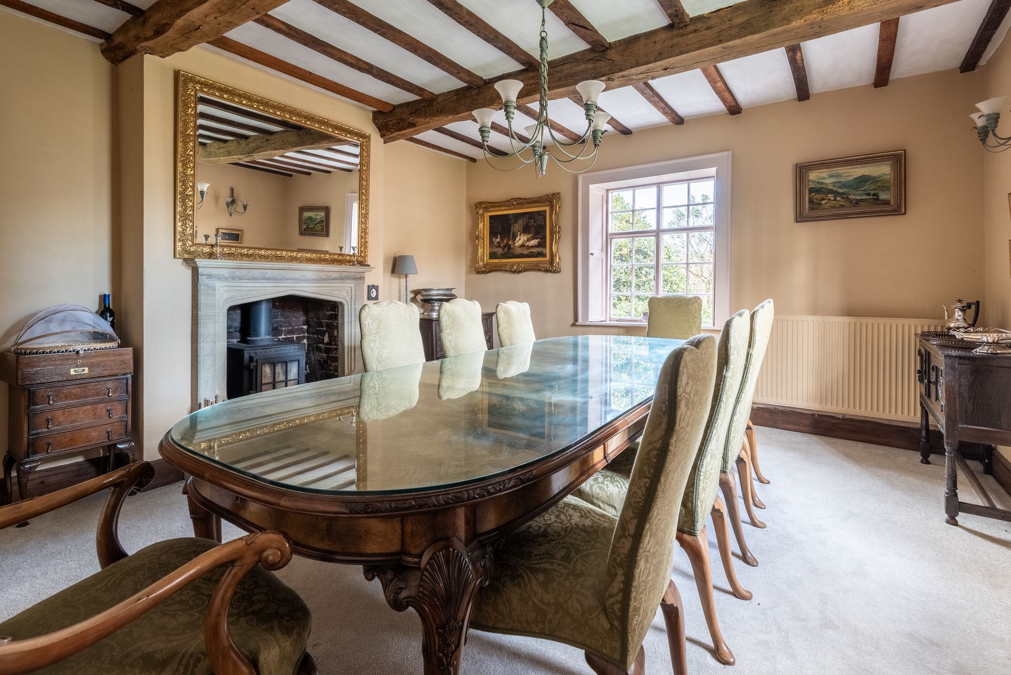 The property immediately reveals its period origins upon entering, with exposed ceiling beams enhancing many of the principal rooms and lending warmth and authenticity throughout. The impressive drawing room is particularly noteworthy, centred around a magnificent inglenook fireplace which forms a striking focal point and creates a wonderfully atmospheric space in which to gather.