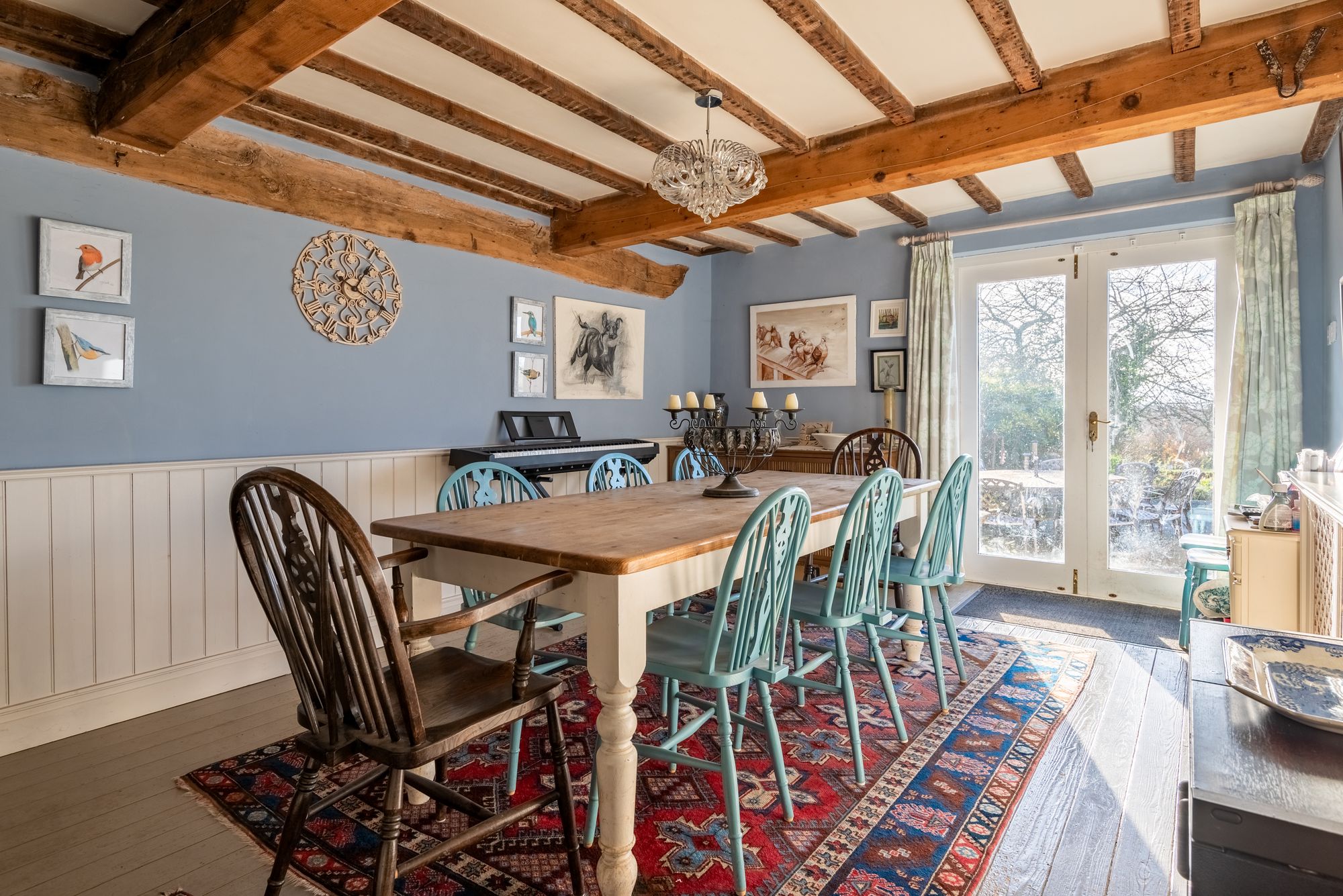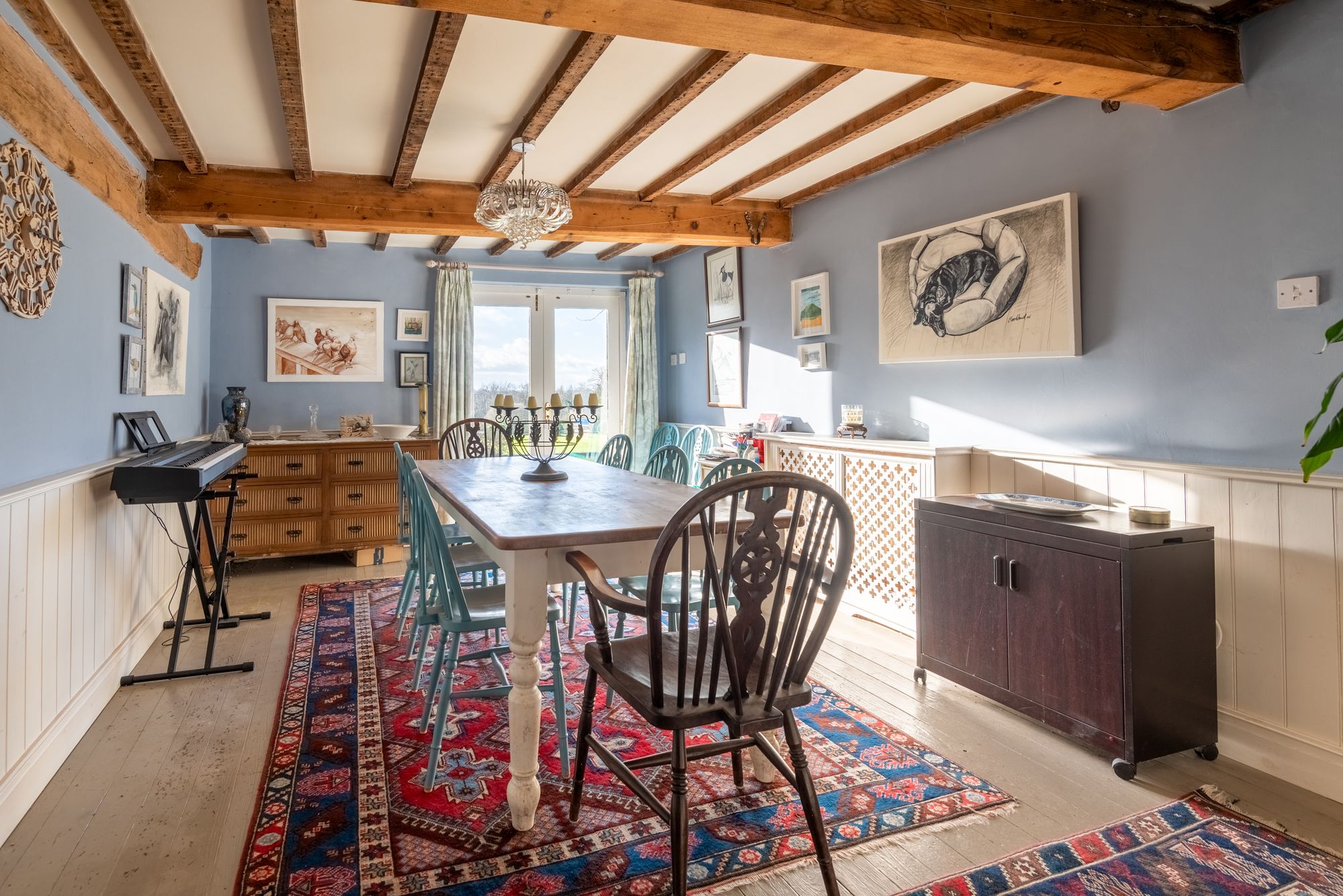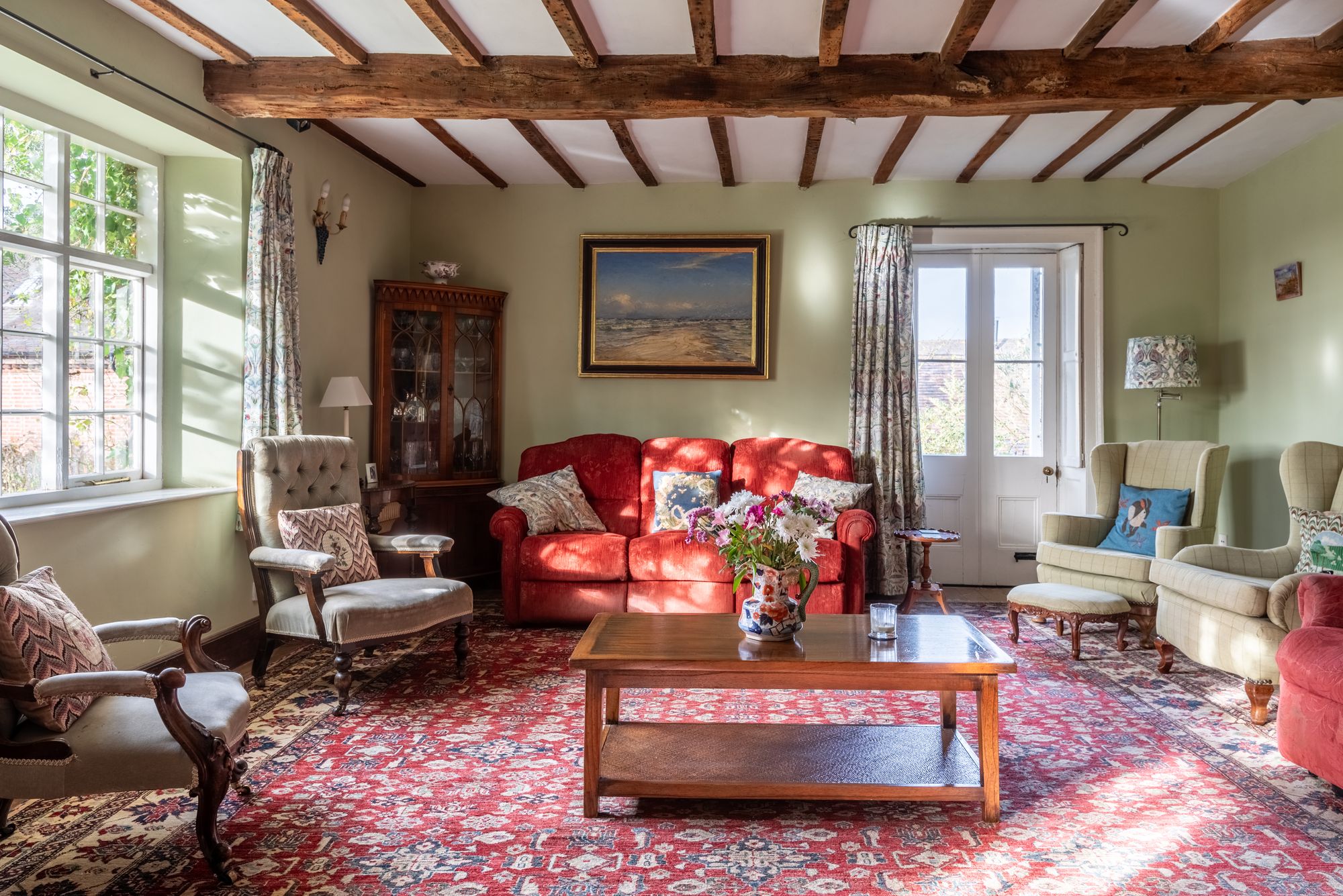The property immediately reveals its period origins upon entering, with exposed ceiling beams enhancing many of the principal rooms and lending warmth and authenticity throughout. The impressive drawing room is particularly noteworthy, centred around a magnificent inglenook fireplace which forms a striking focal point and creates a wonderfully atmospheric space in which to gather.