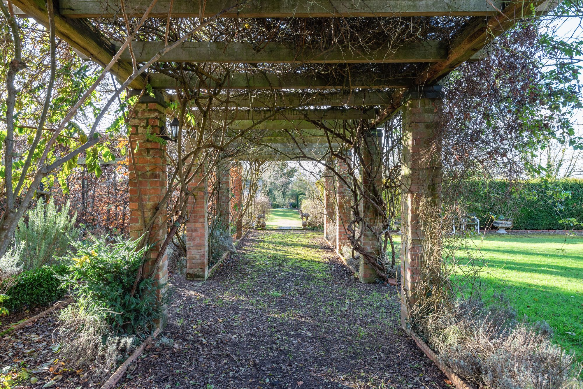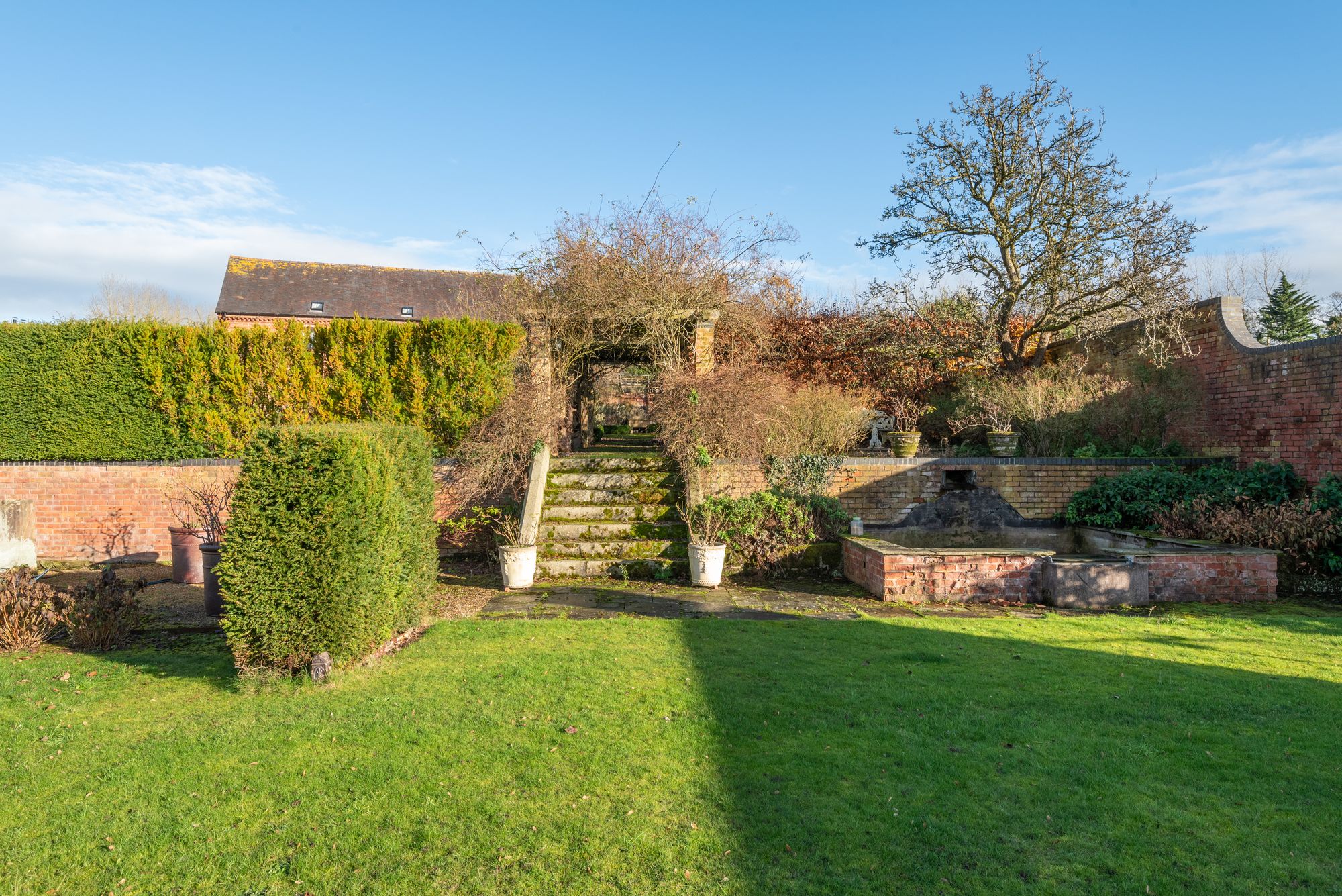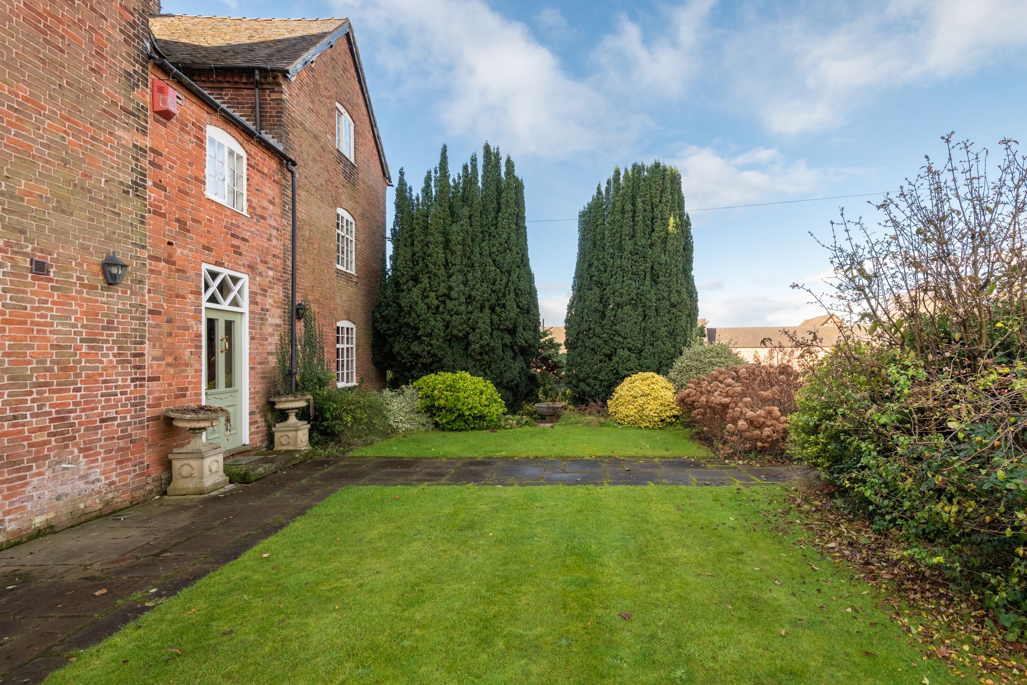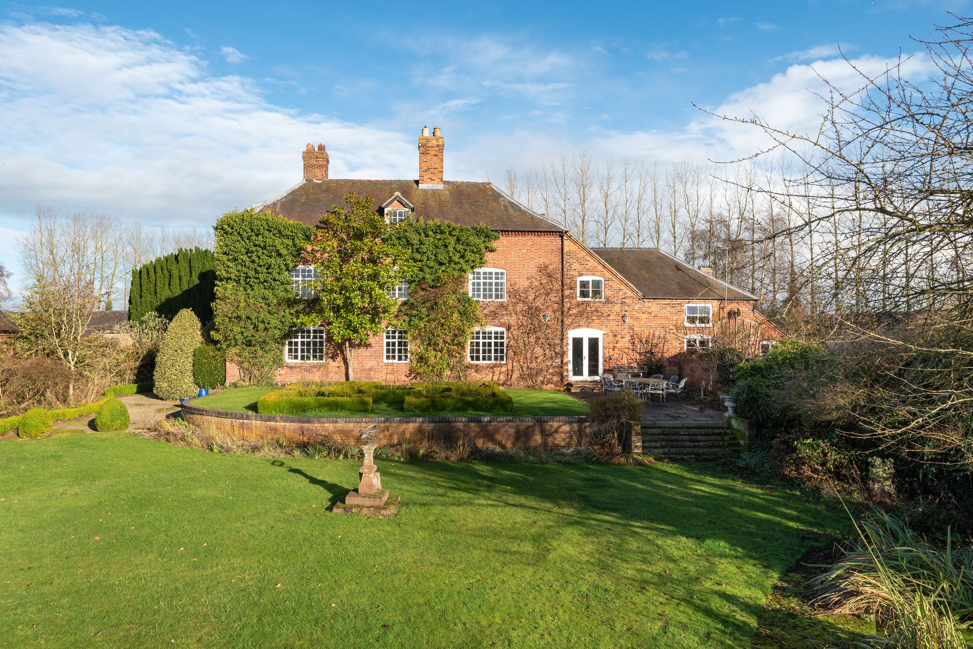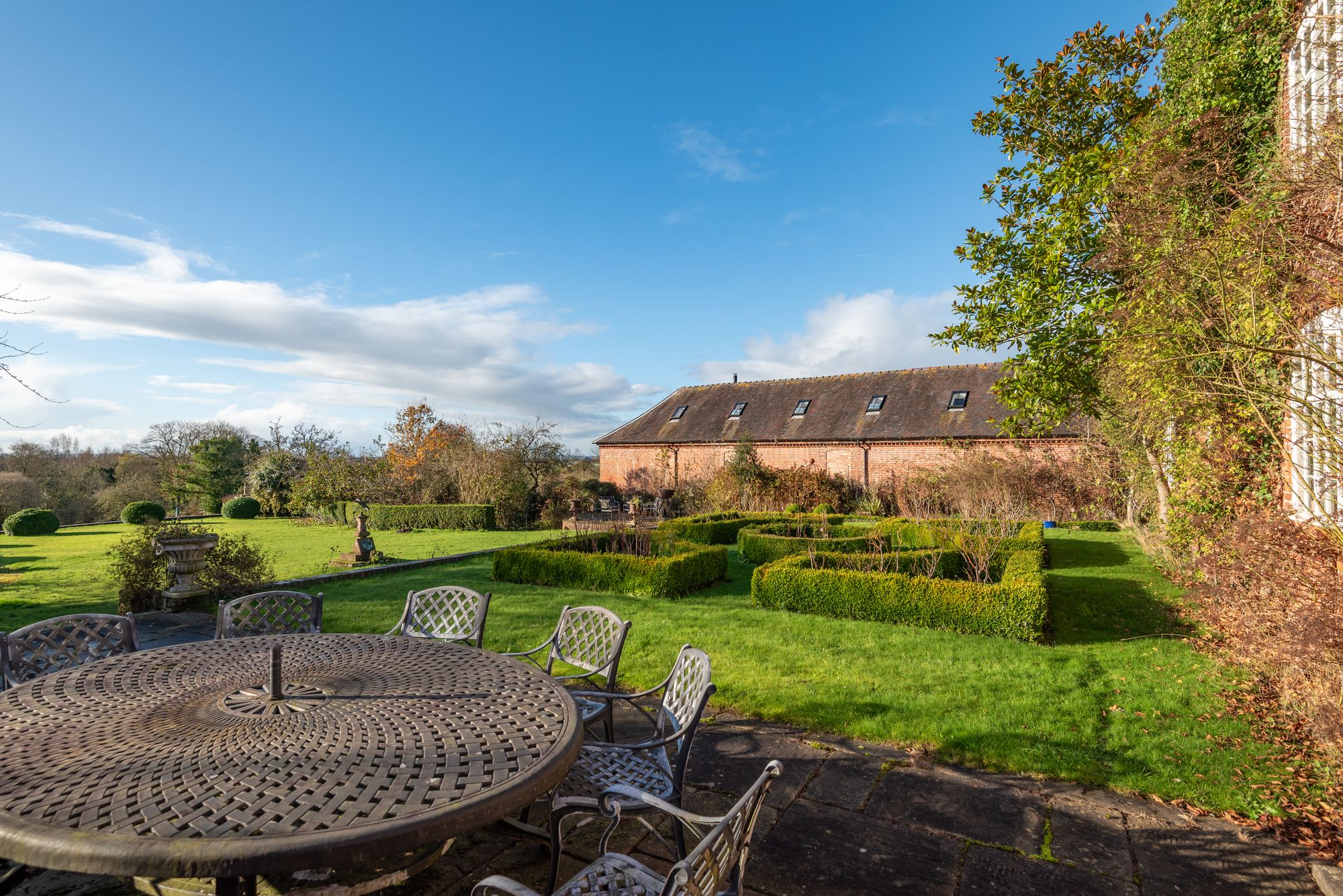 Dodecote Grange is approached within beautifully landscaped gardens which wrap around the house and have been thoughtfully designed to create a tranquil and picturesque setting. Sweeping lawns, mature trees and established planting provide colour, structure and privacy throughout the seasons.